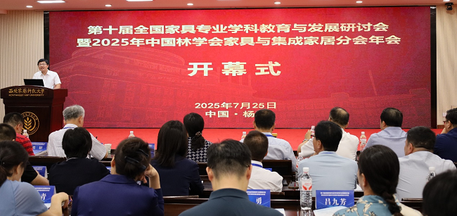 为深化家具专业学科供给侧改革,加强人才培养与产业需求的对接,全面提高家具与集成家居行业人才质量,培养出更多适应家具与集成家居产业发展的创新拔尖人才,进而实现人才推动产业发展,助力“双碳”和“青山绿水”工程。2025年7月24日至27日,第十届全国家具专业学科教育与发展研讨会暨2025年中国林学会家具与集成家居分会年会在我校成功举办。来自全国60余所高校、科研院所、出版机构,以及政府及相关部门、行业协会和企业的200余名专家代表齐聚一堂,共同探讨中国家具专业学科教育、科研与行业发展议题。