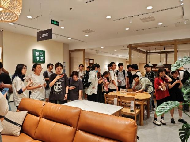 实习第二周,师生转战杭州顾家家居股份有限公司,开启了为期一周的专业探秘。首日,研发中心专家为同学们详细讲解了软体家具从材料筛选、结构设计到工艺转化的完整研发链条。特别对皮革耐磨测试、海绵回弹标准等关键技术指标进行了详细剖析,让同学们深刻体会到"一张沙发背后的科技密码"。随后,同学们参观了顾家家居下沙、江东、前进三大生产基地,沉浸式感受沙发、床垫及定制家具的全流程生产。从自动精准裁剪的数控机床,到灵活协作的机械臂组装工位,再到全程数字追溯的柔性化生产线,现代制造技术正在重塑传统家具生产模式。